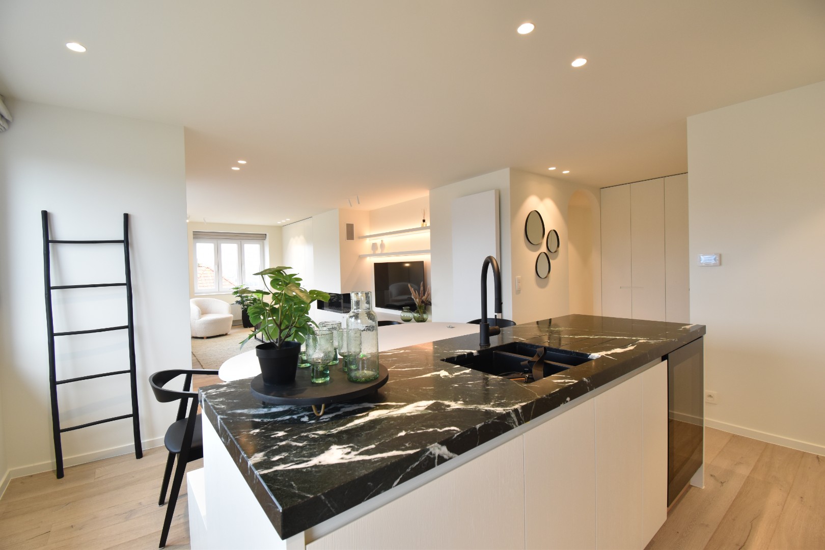 Indeling van het appartement: Inkom met gastentoilet, vestiaire en ingemaakte kasten, ruime leefruimte met een volledig geïnstalleerde open keuken met eiland en aanpalende eethoek, salon met ingemaakte kasten, open haard. Masterbedroom met ingemaakte kasten met aanpalende badkamer met ligbad. Tweede volwaardige slaapkamer met ingemaakte kasten en aanpalende douchekamer. Derde ruime slaapkamer met ingemaakte kasten en aanpalende douchekamer. Apart toilet op de nachthal. Mogelijkheid tot aankoop van een garage. Het appartement is gerenoveerd met oog voor detail en afwerking.