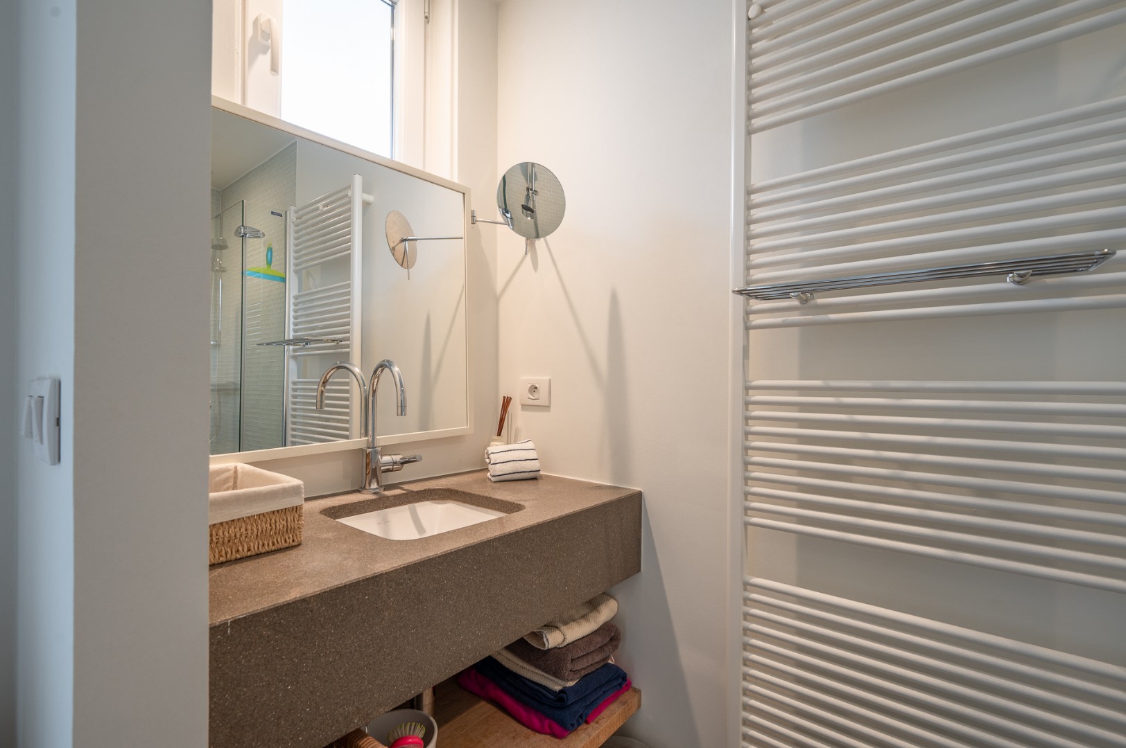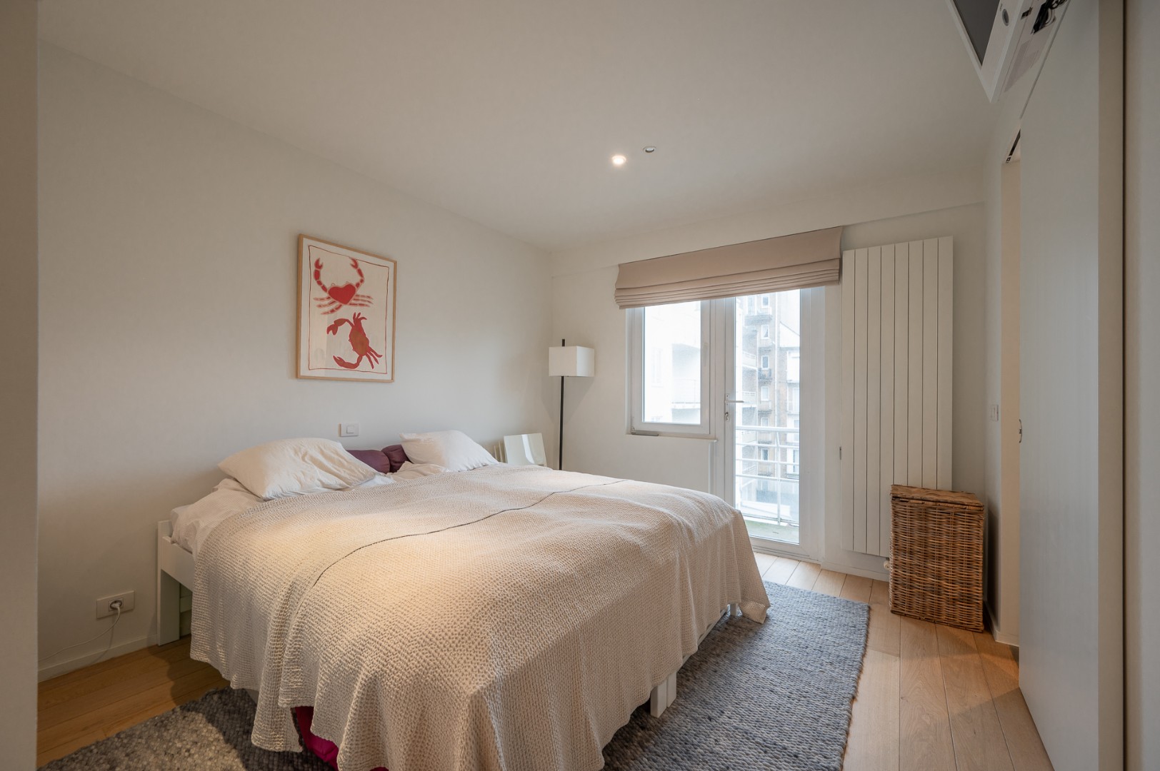 Dit appartement met een knap zijdelings zeezicht omvat lichtrijke woonkamer. De ingemaakte kast omvat een zeer confortabel logeerbed voor 2 personen. Volledig ingerichte keuken met alle comfort (MIELE-toestellen) Apart toilet. Slaapkamer met ingemaakte kasten en ensuite badkamer (wastafel en douche). Via de slaapkamer is er toegang tot een aangenaam buitenterras. Praktische berging met aansluiting voor wasmachine/droogkast. Privatieve kelder en fietsenberging in de residentie.