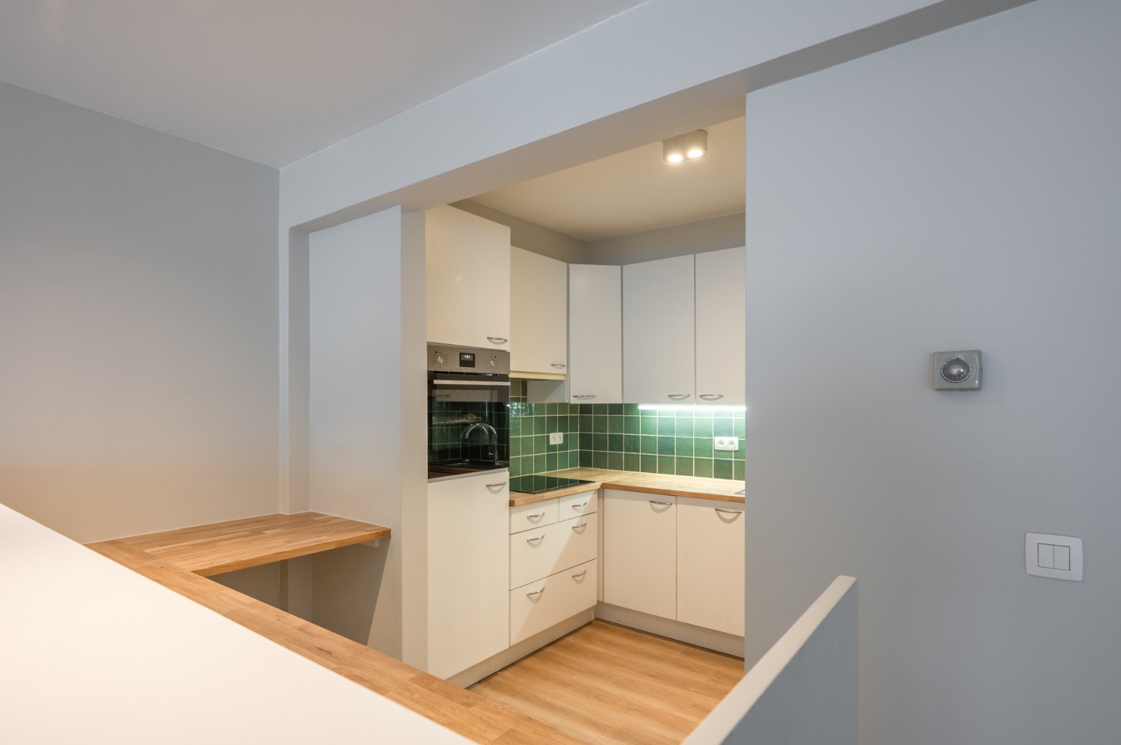 Dit appartement omvat inkomhal met vestiare en apart toilet. Half open keuken met alle comfort.