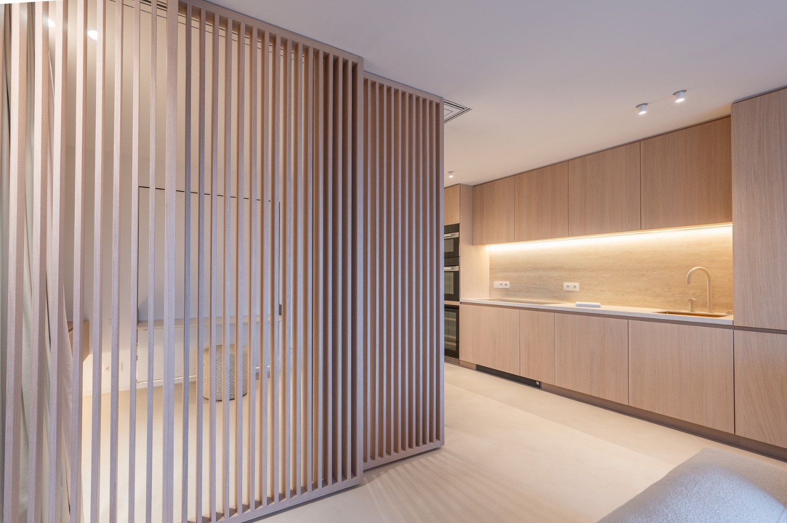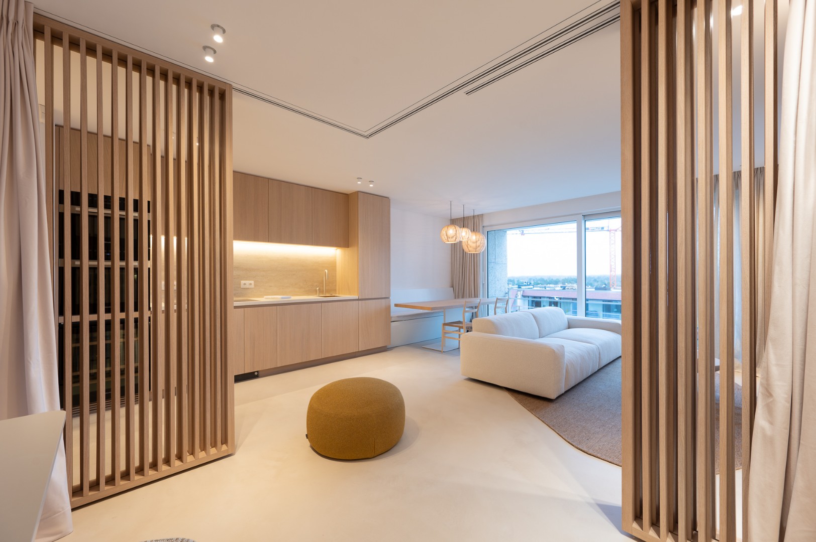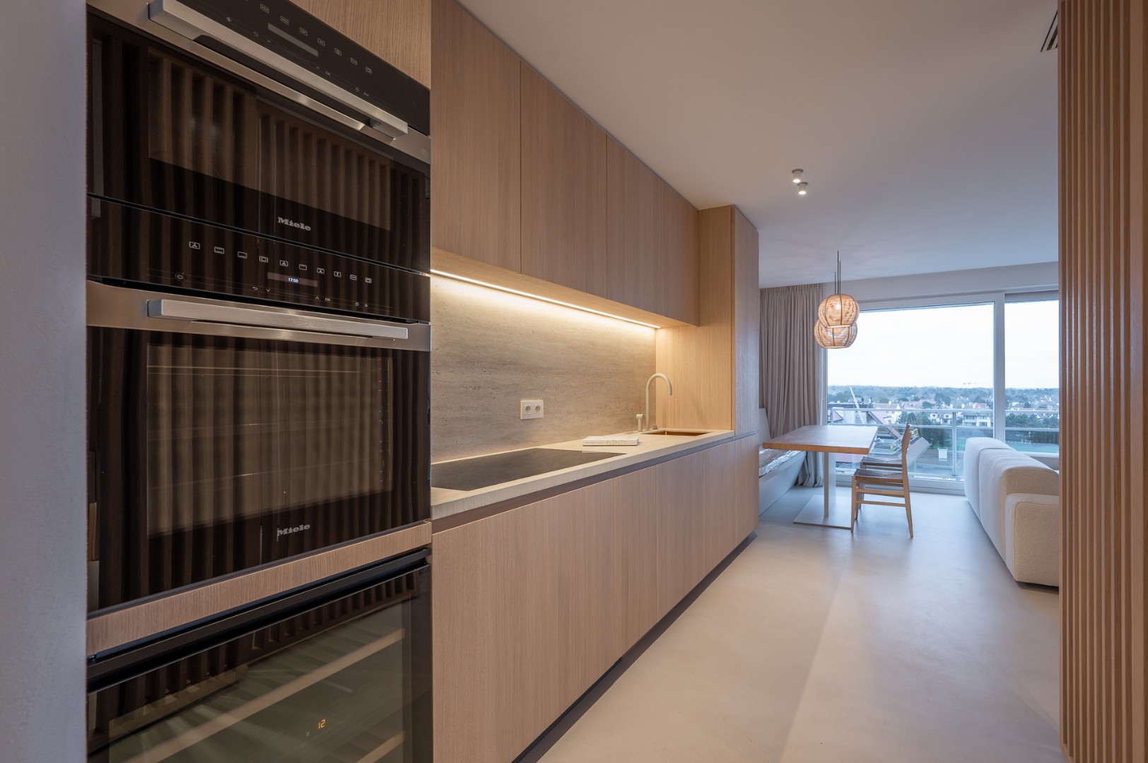 De indeling omvat een elegante inkomhal met apart gastentoilet, een ruime en lichtrijke woonkamer met aansluitend terras dat een uitzonderlijk breed zicht biedt over Het Zoute. De volledig uitgeruste keuken is afgewerkt met hoogwaardige materialen en voorzien van alle moderne toestellen, inclusief een wijnfrigo. Verder beschikt het appartement over twee mooie slaapkamers met ingemaakte kasten en een luxueuze douchekamer met inloopdouche en lavabo.