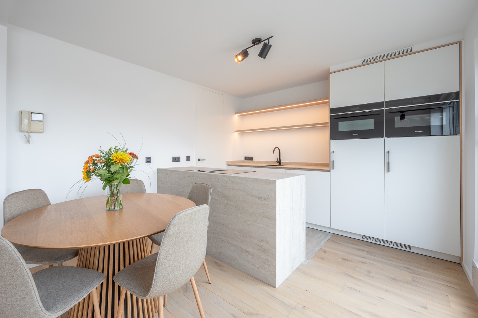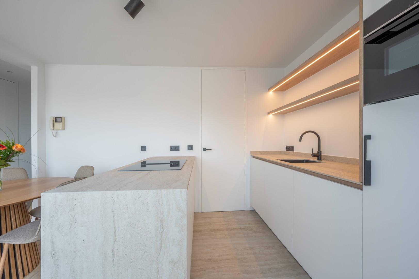 Bij binnenkomst op de 7de verdieping wordt u verwelkomd door een volledig vernieuwde open keuken, uitgerust met de nieuwste apparatuur, die uitnodigt tot culinaire creativiteit. Aangrenzend vindt u een ruime en lichte woonkamer, perfect om te ontspannen en te genieten van het gezelschap van vrienden en familie. Verder is er een apart gasten toilet voor extra gemak en een extra kamer die ideaal kan dienen als bureau of kinderkamer.