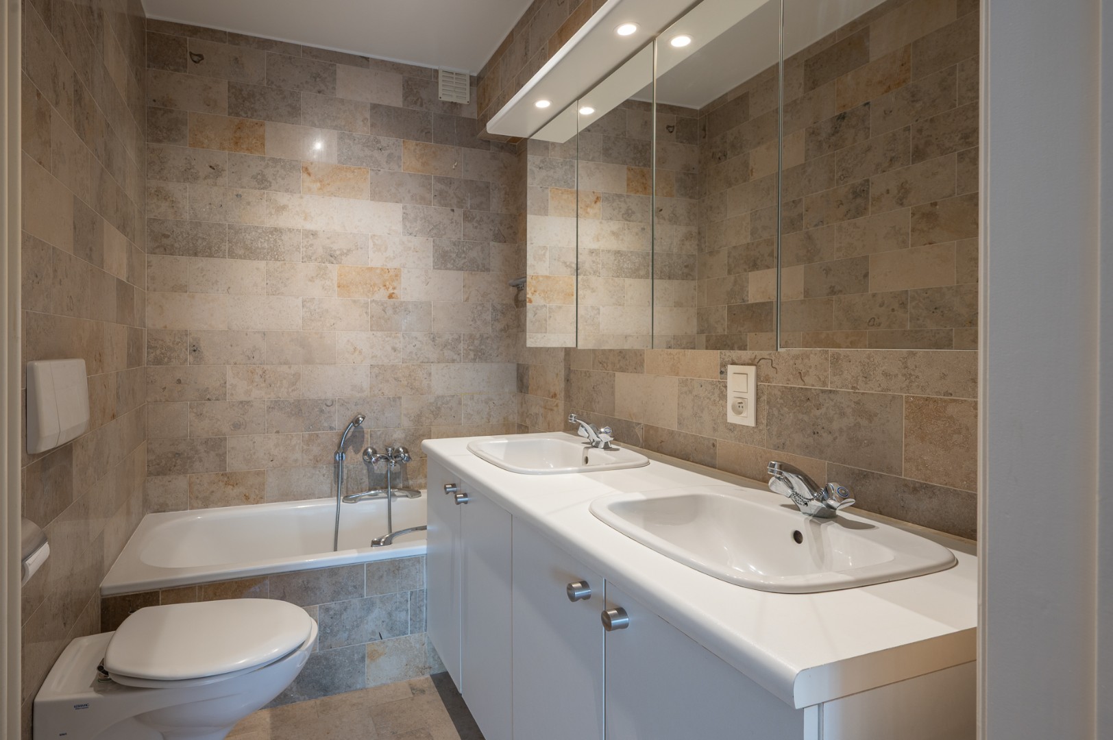 Open keuken vernieuwde keuken met alle comfort. Twee ruime slaapkamers, elke voorzien van ingemaakte kasten. Slaapkamer met bijhorende badkamer, omvattende ligbad, dubbele lavabo en toilet. De tweede slaapkamer heeft een eigen bijhorende douchekamer, met toilet, douche en lavabo. Grote privatieve kelder op het niveau -1, voorzien van aansluiting voor wasmachine. Mogelijkheid tot aankopen gesloten garagebox in de korte nabijheid.